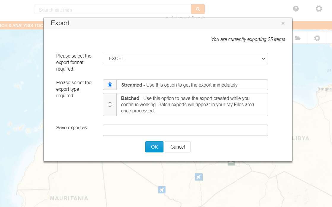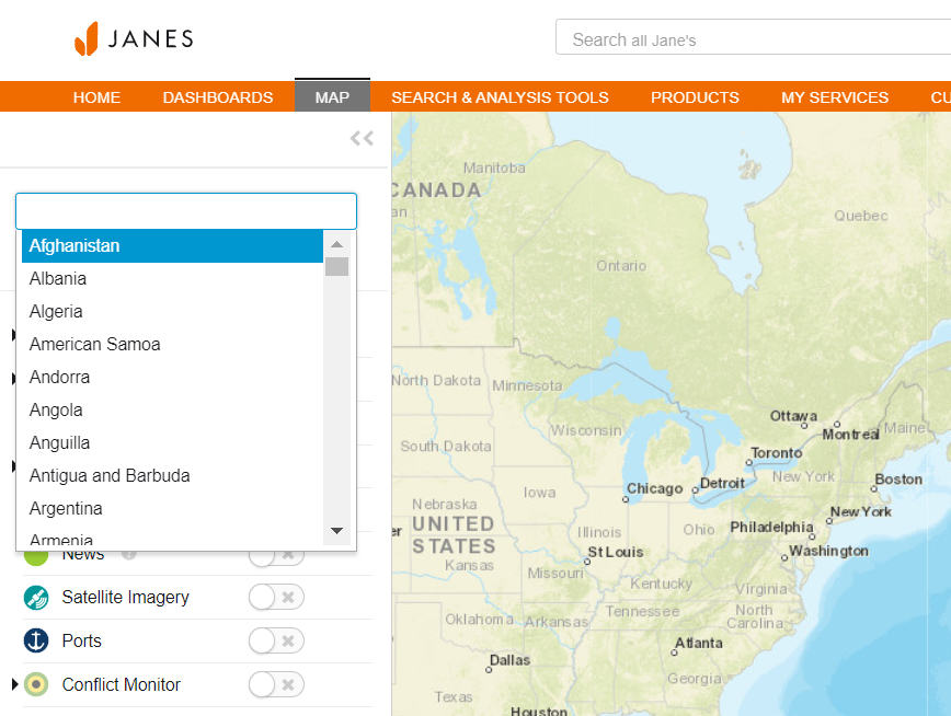 You can access maps through the “Map” tab in the top navigation. The map provides a geospatial environment to display Janes layers. The geospatial layers available will depend on your subscription access.