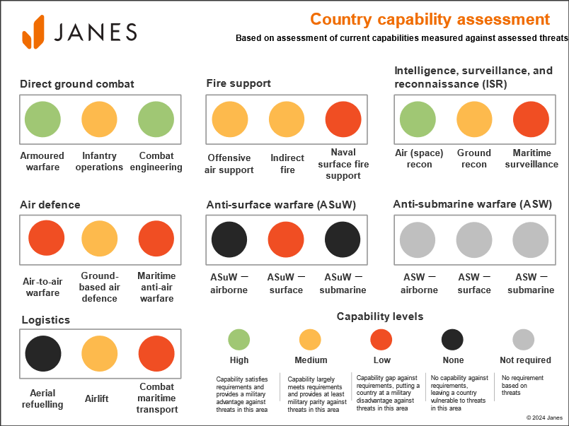Janes Military Capability Assessment Matrix focuses on the assessment of seven capability categories; direct ground combat, fire support, intelligence, surveillance, and reconnaissance (ISR), air defence, anti-surface warfare, anti-submarine warfare, and logistics. Each one of the seven capability categories is further divided into three sub-categories focusing on the land, air, and maritime domains.